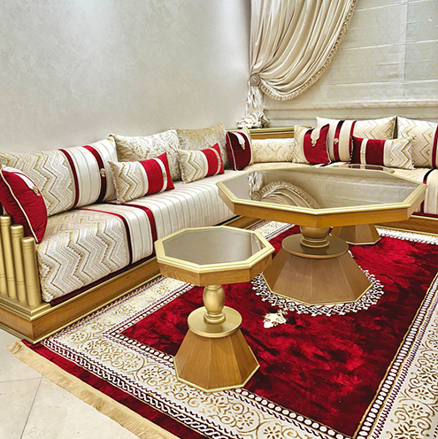Le salon "Rouge Marocain" séduit par son allure majestueuse et ses tons rouges profonds, symbole de chaleur et de passion. Il met en valeur le savoir-faire artisanal à travers des finitions délicates et des motifs traditionnels. Idéal pour un intérieur riche en caractère et en élégance.